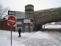 Along Lyman Street, near its intersection with Main, a doorway in the stone wall leads to a staircase built into the core of the formidable structure. At the top of the stairs, perched atop the trestle is Springfield's Amtrak station. Nearby, Main St. itself runs under the trestle through an archway of heavy voussoirs. Until its recent closure, Stone Wall Tavern was the neighborhood's smallest yet most distinctive watering holes. Wedged between the street corner and the Southeast abutment of the granite overpass, the shuttered building was once a welcome way station for local and long distance travelers.