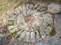 I've always been an admirer of gadgets. A hand-pump that sucks the air out of an uncorked bottle of wine to reseal it for pouring another day is a cool gadget in my estimation. Another recent acquisition that qualifies as an awesome gadget is my new iPhone. While traveling through New Jersey not long ago I typed "museum" into the "Yelp!" app and saw that there was a Gustav Stickley Museum just off the highway. Five minutes later Elin and I were walking the grounds of the Craftsman Farms that Stickley established in 1908. He was a leading spokesman for the Arts and Crafts Movement and a furniture designer and manufacturer. The Craftsman Farms was meant to be a showcase for the "fine plainness" in art and living that he espoused. In the patio outside the main house of the museum was a stone artifact that caught my attention; a mill stone. It's not unusual to see old grind stones re-purposed as yard ornaments but this one was unique for being made from a number of stones banded together with a steel rim. Most mill stones that I've seen are monolithic. Perhaps the type of stone used for this wheel was too brittle to be quarried in large blocks. I thought it was a clever way to create a large wheel from small pieces. Ingenuity is to be admired whether it's in an iPhone or a grind stone.